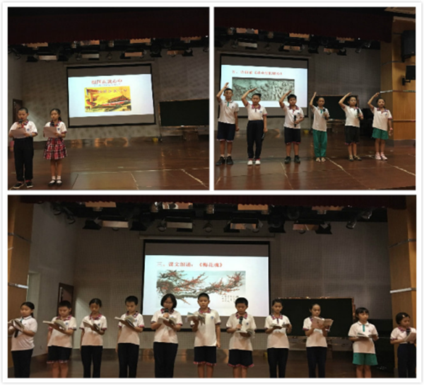 活动在升旗礼中拉开了序幕,小主持分工明确,声音抑扬顿挫,很好地引导各个环节、各个节目有序进行。在活动进行中,《国旗、国徽、国歌的故事》告诉我们国旗、国徽、国歌是我们祖国的象征,无论在何时何地,我们都要爱护它。课文朗诵《梅花魂》让我们感受了一位身在异国的华侨老人一颗眷恋祖国的心。《民族英雄故事》提醒我们今天幸福无比的生活来之不易,是那些视死如归的英雄先烈用自己的鲜血和身躯换来的,是英雄们用美好的青春,用闪光的年华,迎来了春天,迎来了光明。诗朗诵《请英烈们放心》表达了孩子们在幸福的今天,没有忘记历史,没有忘记这些英雄,也没有忘记先辈们给我们留下的优良革命传统。在《里约奥运女排夺冠》视频中,中国女排顽强拼搏、永不服输,感动了在场的师生,也让我们知道爱国不仅仅体现在保卫国家,保卫人民的战争中,也表现在为国争光的奥运赛场和平凡的工作岗位。接着同学们大声朗读《爱国的名人名言》,声情并茂地合唱《龙的传人》,充分展现了自己对祖国的自豪感,增强了爱国热情。