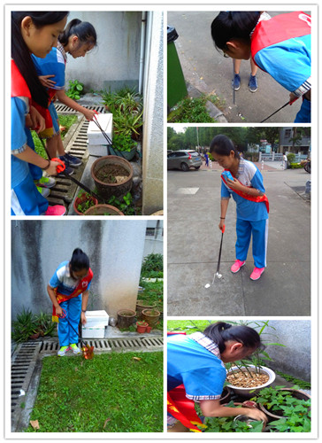 我们一共分为三个小分队,第一小分队拿着预防登革热的宣传单,十分礼貌地向来来往往的叔叔阿姨爷爷奶奶派发传单,并提醒他们要注意登革热的传播。第二小分队每人手上拿着一个铁钳,一点一点地拾起地上的果皮纸屑,把社区和草丛中的垃圾清理地干干净净。第三小分队不停地寻找哪些居民阳台的花盆中是否有积水,发现有积水的花盆,他们二话不说就端起来倒掉,兢兢业业地帮居民们清理积水。