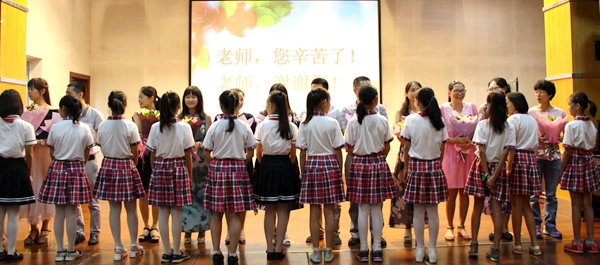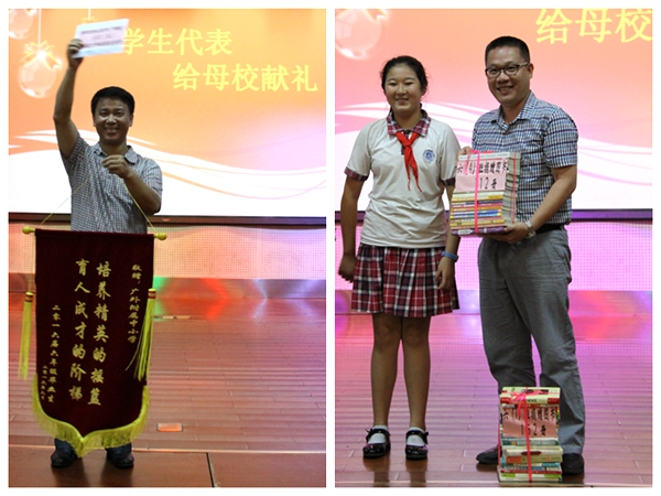 典礼中,诗朗诵《母校,老师,我们谢谢您》和小合唱《今年夏天》表达了同学们对母校,对老师,对同学深深的依恋和不舍;歌伴舞《长大后,我就成了你》和手语操《感恩的心》更是将真诚的感恩之心深深地融入到了每一个表情和动作里。雷思雨同学代表全体六年级毕业生对母校、老师、父母这六年的悉心栽培和辛勤教育表达了最真挚的感谢,倡议同学们回望过去,远眺未来,用更加优异的学业成绩来回报母校、老师和家长的关爱。随后,同学们为老师送上了鲜花与祝福,一声声“老师,您辛苦了;老师,谢谢您!”响彻礼堂,催人泪下;同学们也为学校敬献锦旗和近500册图书,为学校的文化建设献出一点绵薄之力,以表达对母校的热爱。