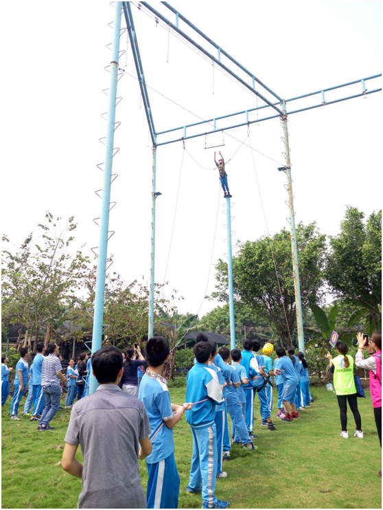 高空挑战旨在鼓励学生勇于挑战自己。在此项目中,学生爬上高空站台,其他同学则控制绳索,以保护该同学的安全。当同学们战胜恐惧,站在高台上后,更需要大胆的一跃!除了高空一跃,该项目还包括高空平衡木等挑战。在这一环节中,老师同学们都为站上高台的同学鼓励加油。