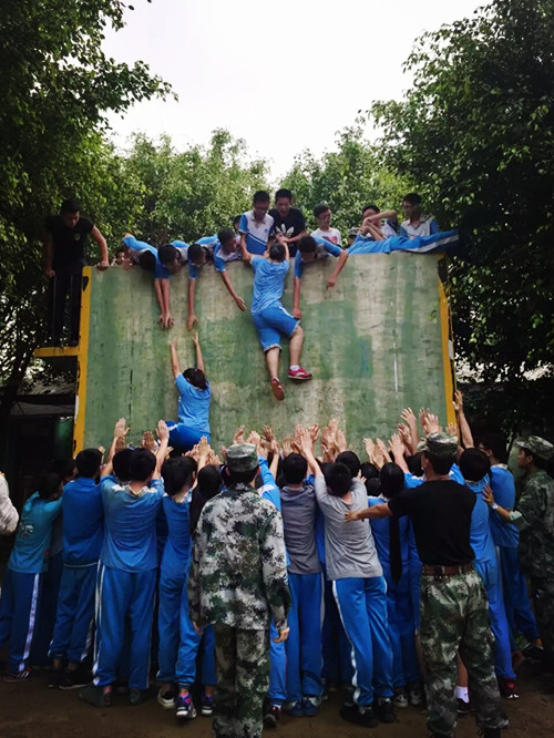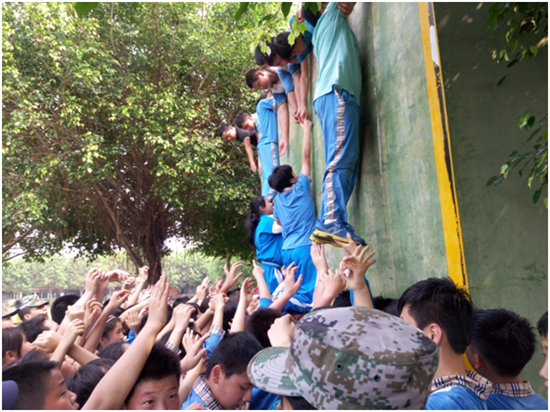 这项活动可谓是最辛苦但也是最令人感动的一项。身体健壮的同学作“人梯”将其他同学送上墙的顶端。在顶端另一些同学则伸出援助之手,将同墙面上的同学拉上来。爬墙的同学会感到无助,因为他们悬在空中,无从发力。但底下和墙上同学的推力或拉力让悬在空中的同学倍加感动。虽然“人梯”和顶上的同学已非常疲倦,但他们还是会对眼前无助害怕的同学伸出援助之手。
