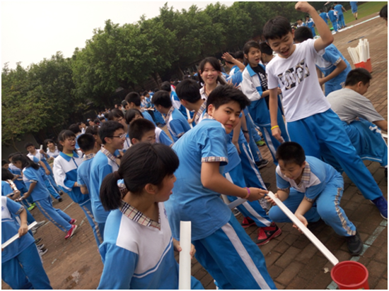 在南水北调活动中,每个同学拿到一截塑胶管,大家需通力协作将乒乓球从一段运到另一端的塑料桶内。这个过程中,乒乓球会因个别管道的角度原因而掉落,但同学们并没有抱怨,而是一次次的重新来过、共同努力,最终迎来成功的喜悦!