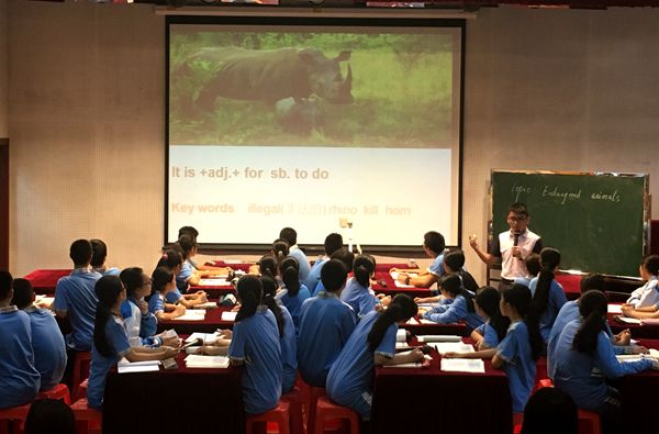 张晓鹏老师的“Endangered animals”英语课,用了成龙呼吁保护濒危动物的英文宣传片作为导入,从视频中学生了解到了当下濒危动物的种类,为下面的学生活动提供了写作材料,开篇便埋下伏笔。其中,在学生角色扮演活动中——由2名学生扮演WWF(世界自然基金会)的新闻官回答同学关于濒危动物的提问,一名记者的问题令人印象深刻。他向新闻官提问到:“如果您遇到了濒危动物的袭击,而您手里刚好有一把枪,请问您是会用枪杀了这个濒危动物还是让它杀了您?”而学生新闻官思考了几十秒后有条不紊地回答道:“我会首先选择用其他办法吓退这个濒危动物,让它放弃对我的袭击。如果这个办法不管用的话,那为了自己的生命安全我最后还是会选择杀掉它,但是我会带走它的基因以求通过克隆技术能克隆出它的后代以至于这种动物不会灭绝。”精彩的提问与绝妙的回答都赢得了在场师生们自发性的掌声。这不仅展示了附中学子们平时训练有素的口语能力、临危不惧的现场应变能力,也体现了附中学子们在学习上的敢想敢问、不断创新的精神。