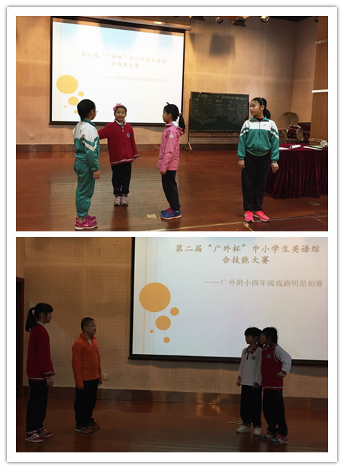 本网讯为迎接第二届“广外杯”中小学生英语综合技能大赛,四年级组举办了英语戏剧明星大赛。全年级共有8位同学参加,他们是由各班英语老师选出的佼佼者,在这8位同学中最后选定2人参加总决赛。比赛前,评委老师宣布比赛规则。4名选手一组,每组各选一名代表抽取要表演的戏剧剧本,20分钟的准备时间,最后正式表演。