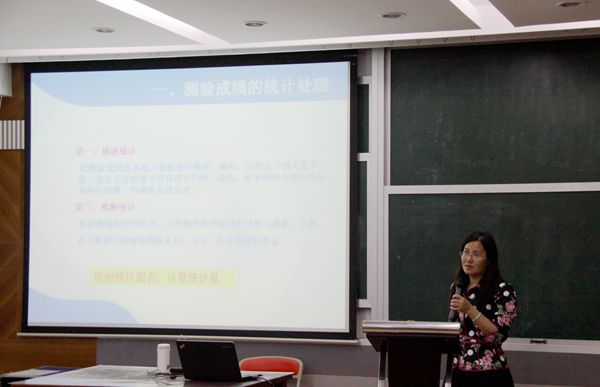 会上,钟杏梅老师从“描述统计”、“推断统计”等几个方面将测验成绩及其相关数据进行整理、概括,使大量零散、杂乱无章的数字及其分布特征清晰、明确地显现出来,并根据测验提供的信息,运用概率的理论进行分析与推断,从而根据已知情况诊断学生学习状况、鉴定学生学习成果、制定后续教学方案、引导学生系统复习与钻研知识为下一步决策做好准备。