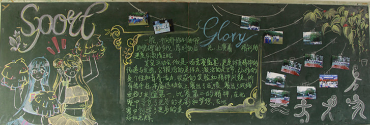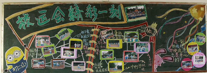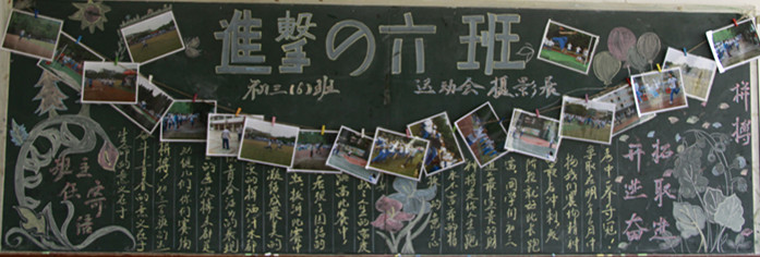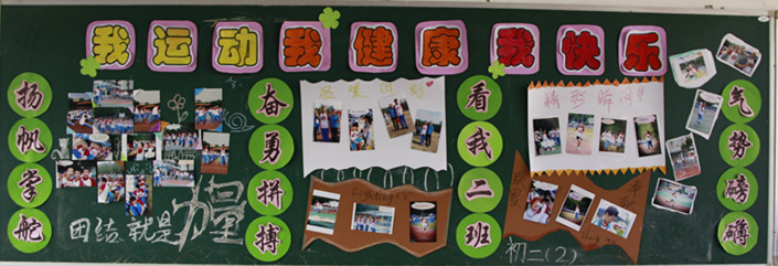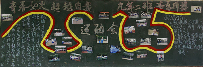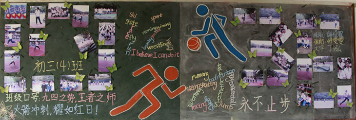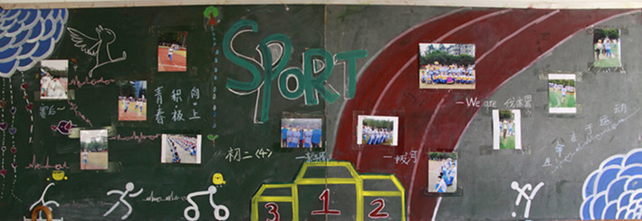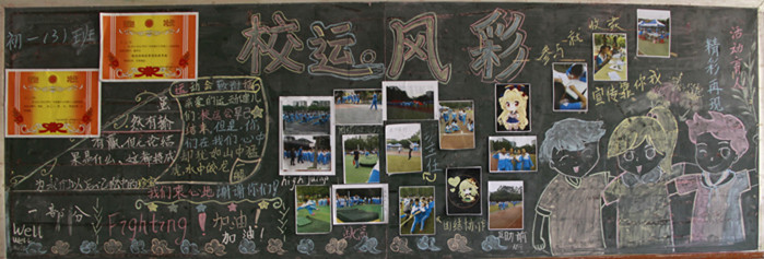 各班师生积极行动,对板报的设计和布置都做了精心的准备,以不同的特色展示出各班不同的精彩,图文并茂地向同学们展示这次运动会昂扬的斗志,饱满的激情,收获的喜悦。