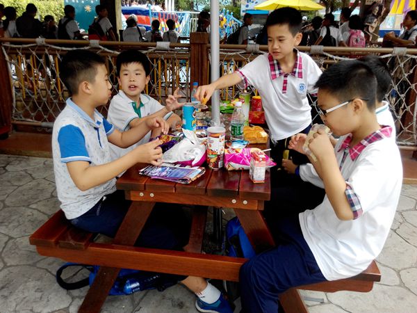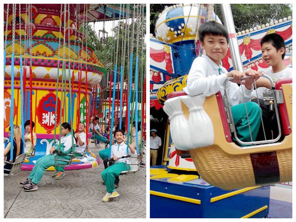 高年级的同学自然要追求点刺激与速度,“十环过山车”是他们的第一选择。长长的人龙也打不倒他们的热情。在尖叫声停止的那一刻,有的人吐泡沫了,有人站也站不稳,也有人大喊好玩;更有胆大的老师和同学,挑战号称全球最大的“大摆锤”,它最高时速110公里/小时,最大摆幅240度,飞上42米高空,天旋地转之间,令人目炫神迷,惊心动魄;个别的同学选择了垂直过山车,它是所有游乐项目中刺激指数排名第一的。它的设计也与大多数的过山车不同,三排座椅的设计让它看起来象飞行中的鸟,据说其设计灵感来自于飞行中的雄鹰。缓缓上升到20米的高空,稍停顿,以极快的速度,垂直俯冲,几秒钟后冲入底部,没有缓冲直接转到环形轨道,接着滑行到一个平台,又一次垂直俯冲……听到的是风声,感觉的是心跳!