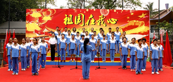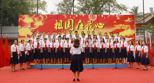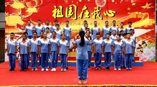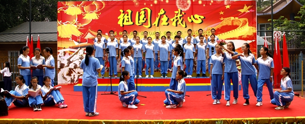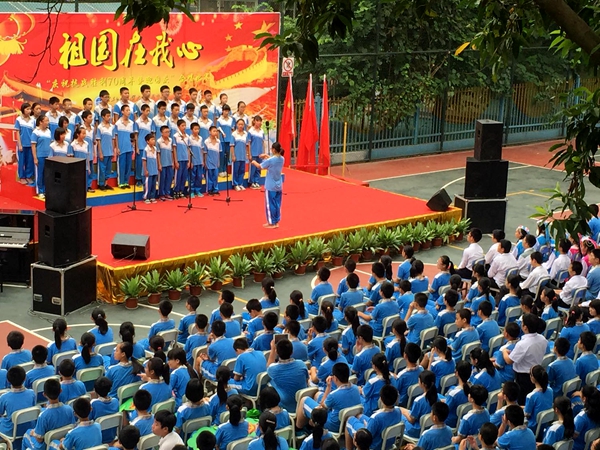 “我们都是神枪手,每一颗子弹消灭一个敌人,我们都是飞行军,哪怕那山高水又深,在密密的树林,到处都安排同志们的宿营地,在高高的山冈上,有我们无数的好兄弟。”合唱比赛在初一(2)班同学整齐嘹亮的《游击队歌》中拉开了序幕。同学们放声歌唱,用最甜美歌声抒发对祖国的热爱,用最纯真的笑容赞美幸福的生活。不论是小学生,还是中学生;不论是经典的《歌唱祖国》《团结就是力量》《我的中国心》,还是充满童心童趣的《少年少年祖国的春天》《听妈妈讲哪过去的事情》《我爱北京天安门》,同学们都演唱得真挚深情。台上的学生认真投入地演唱、指挥稳定富有激情地指挥,台下的同学们仔细聆听、认真欣赏。一首首歌曲在学校上空回荡,一阵阵掌声响彻校园。