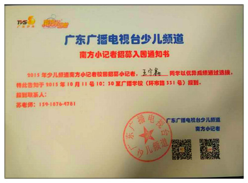 此次活动经过层层筛选,最终有42名同学参加最后的面试,共有6名学生在新闻采访、报道中能脱颖而出,成为广东南方电视台的小记者,并正式给他们颁发证书,他们分别是梁子韵、王宁鑫、王美慧、毛晨可、叶梓昀、唐伊莉。
