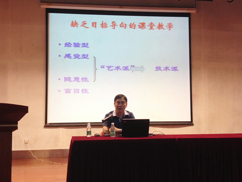 李伟成主任在初中、高中以及大学先后有过任教经历,对市内外老师也进行过多次培训,发表了很多与教育教学相关的论文,在教育教学方面有着丰富的实践经验和深厚的理论素养。李主任从教学目标与教学内容的关系谈起,他认为教学目标是灵魂(方向)、教学内容是躯体(载体),缺乏目标导向的课堂教学是不完整的。同时他根据自己的经验总结重点阐释了什么是教学目标、教学目标的作用,并提出当前教学目标设计存在的问题。最后,他还系统归纳了教学目标设计的方法。