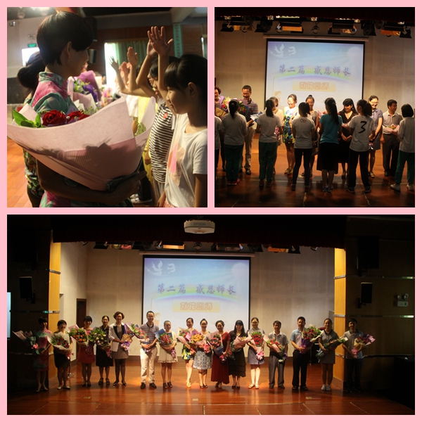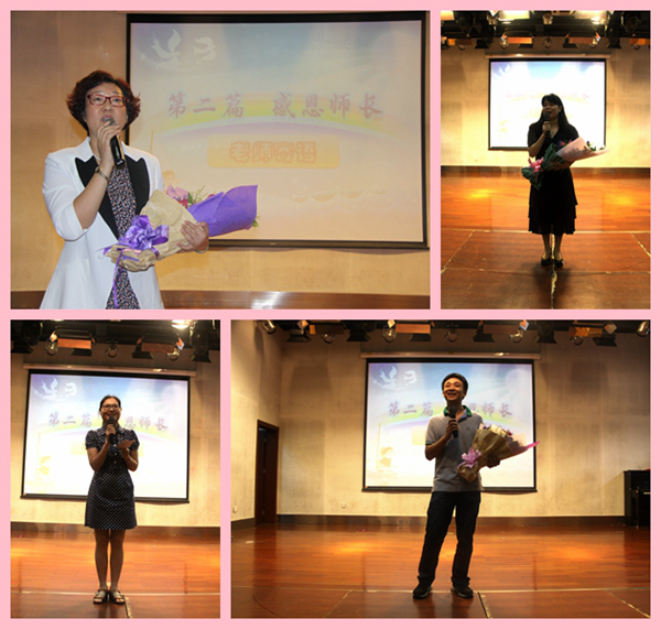 全体毕业班的任课老师与学校领导相继走上台去,在学生们一片欢呼声、尖叫声中,开心接受孩子们的鲜花和敬礼。随后张慧华,刘欣、旷文虹、刘娇等老师,深情洋溢地送上了对学子的殷切期望与祝福。环节最后,学生代表结合手语合唱了一首《感恩的心》,将现场气氛引向高潮。