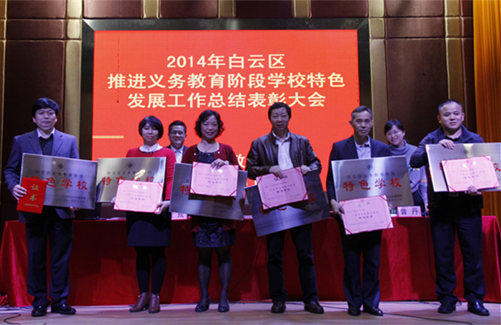 本网讯2015年1月29日上午,白云区教育局召开了2014年白云区推进义务教育阶段学校特色发展工作总结表彰大会,我校被白云区教育局授予“白云区义务教育阶段特色学校”称号。