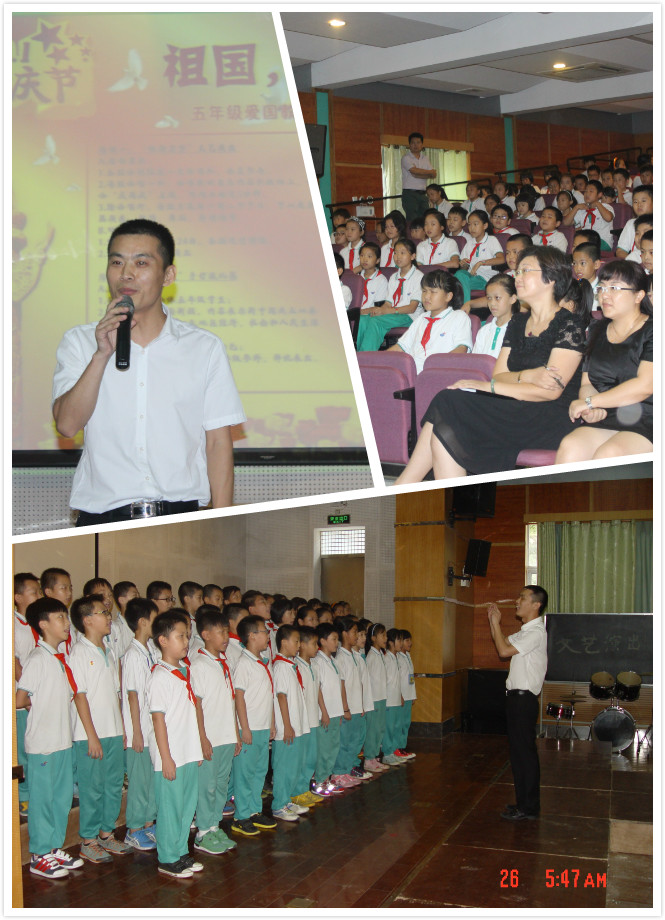 本网讯9月25日下午,五年级全体师生聚集在云山礼堂,开展“祖国我爱你”爱国主题活动的启动仪式,张主任、汪主任、大队辅导员余凤老师参加了本次活动。
