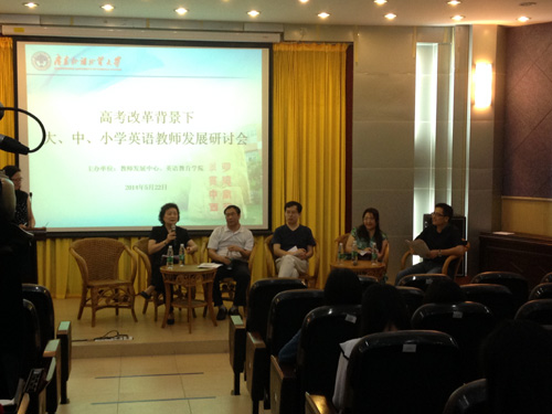 本网讯5月22日,“高考改革背景下大、中、小学英语教师发展研讨会”在广东外语外贸大学七教水上报告厅隆重举行。来自广外教育集团旗下的中小学的教师代表、中山大学夏纪梅教授、广东外语外贸大学冯光武教授等参加了此次的研讨会,共同探讨英语教学改革问题。