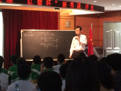 接着初二数学课《平均数》,从两种糖果混合求平均单价的问题引入,不断变换条件,学生自主生成“算术平均数”和“加权平均数”的概念,老师没有对这两个概念加以强调。也不用文字叙述。但概念时隐时现,贯穿于整节课之中。这种淡化概念的做法让人耳目一新。课堂的后半段师生围绕“权”的问题来开展。认识“权”,理解“权”,应用“权”。尤其其中一个应用“权”的开放性问题,学生的精彩发言博得了与会老师的阵阵掌声。值得一提的是,课堂上老师刻意抓紧时机对学生渗透德育、数学文化和思维方法的教育。
