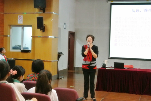 课上,范老师就如何读书、如何分析人物形象、如何领悟作者所要表达的情感的方法等都作了详尽而又易掌握的指导,再加上课件的辅助,整堂课都深深地吸引着孩子们。礼堂内不时传出朗朗的读书声及雷鸣般的掌声。范老师精彩的讲解激发了孩子们读经典、说经典、讲经典的热情,指引孩子们养成良好的阅读习惯,不断提高审美修养,夯实文学底蕴。