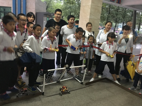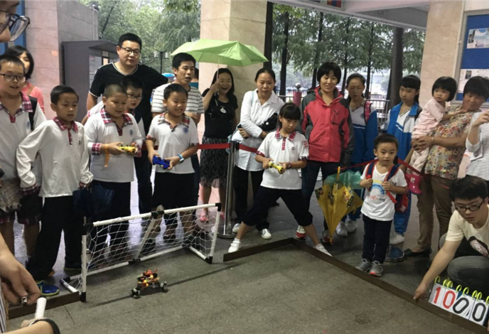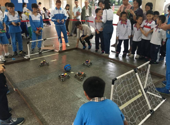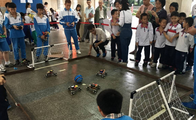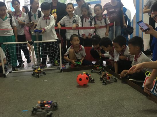 本网讯 10月18、19日,我校举办了2016届“智慧河杯”机器人大赛,校内机器人科技班小学组和初中组的同学们,操作着亲手制作的机器人小车,与同班的对手展开激烈的足球比赛,并在“大战三百回合”后决出胜负。比赛吸引了许多小粉丝,还引得家长们驻足围观,现场欢呼声不断,精彩连连。