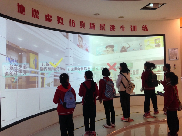 地震局工作人员热情接待了我们,在解说员的带领和讲解下,大家先了解了世界多发地震带及分布图,知道了很多关于世界地理方面的知识;接下来参观上地震仪的发展变化历程,从张衡发明的地动仪到前苏联的基尔诺斯地震仪等,最后发展到便携式小型地震监测仪,同学们还到试震互动带体验了地震监测仪的工作原理,同时感叹人类科技的进步。接下来,工作人员又带我们参观了一些模型,从这些模型能直观体现地震正断层、逆断层、走滑层三种地质结构所形成的不同地震类型,以及它们所带来的不同程度的危害。工作人员与学生互动:地震来了我们应该如何逃生,学生参与度非常高,积极谈自己的应急处理措施,最后大家总结,在地震来临时,我们一定要作好信息储备与物资储备。同学们还积极体验了虚拟仿真场景逃生训练。