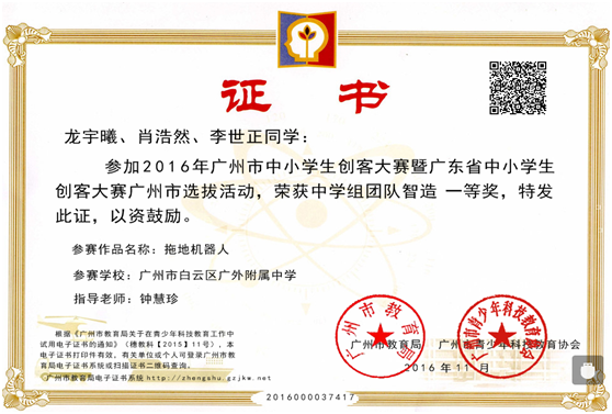 本学期,我校开展创客教育的试点,取得了一定的成绩。其中,龙宇曦、肖浩然、李世正同学发明的拖地机器人在参加2016年广州市中小学生创客大赛暨广东省中小学生创客大赛广州市选拔活动中,荣获中学组团队智造一等奖,并入围广东省创客比赛。随着创客教育在我校的不断成熟,它将全面落实到普适课程当中。这也充分体现了我校以提高学生综合素质为目标,为学生未来发展奠基美好人生的育人理念。
