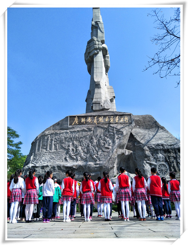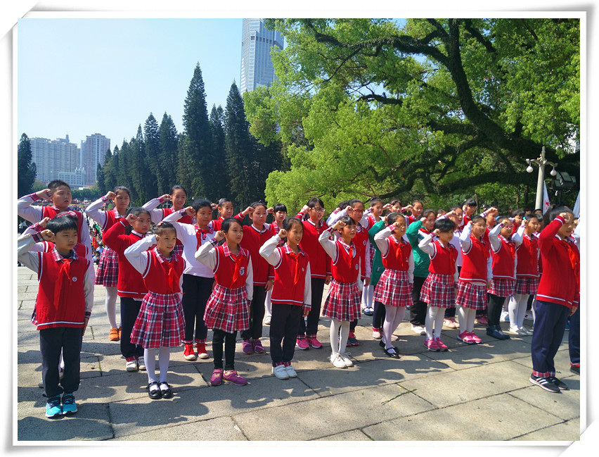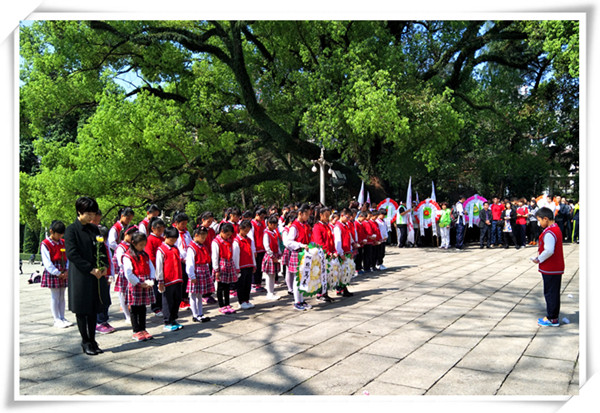 纪念碑前,队员们有序地向革命烈士敬献了自己亲手折的纸花圈,为英雄烈士们默哀三分钟,接着,大队委学习部长辛雨轩同学代表讲话,她号召所有同学们一定要永远铭记革命烈士的光荣事迹,珍惜今天来之不易的幸福生活。随后,所有同学在大队长肖尔玉的带领下以红领巾的名义庄重宣誓:诚实勇敢,自律自强!最后,朱副主任也向队员们提出了殷切的希望。整个祭扫悼念仪式简短而隆重,同学们没有了往日的喧闹,神情肃穆,深切哀悼革命烈士的英灵。