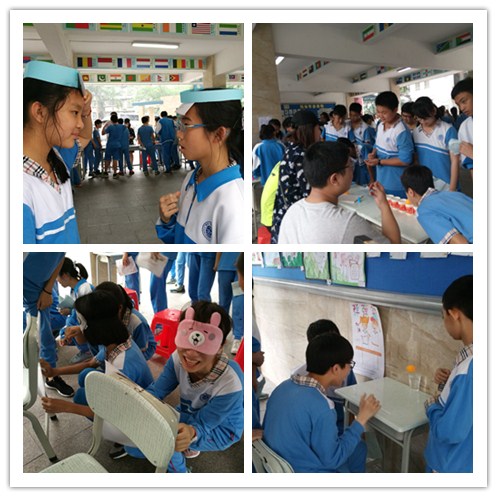 本网讯 5月22日下午3:40-- 4:50 ,我校初一年级在校园架空层及礼堂门口两个空地举行了初一年级心理游园活动。初一年级的全体师生、4位大学实习生参加了游园活动,广外大心理社团的6名大学生也带来了两个游园活动项目,他们的参与使得本次心理游园活动更加丰富多彩。14个活动项目中有促进成员间相互合作及默契的“万花筒”、“你比我猜”、“超级大头贴”、“三人夹球跑”、“贴鼻子”、“抓手指”等,也有增进学生记忆力的“对对碰”、“交头接耳”等,“超级比一比”、“读懂别人的情绪”等项目使同学们体会到了表达情绪和懂得理解他人情绪的重要性,“练口才”既训练了学生们的即兴口头表达能力,也增强了自信心。“吹乒乓球”、“弹弹球”及“扔乒乓球”等个人项目使同学们在游戏中体验到了快乐。