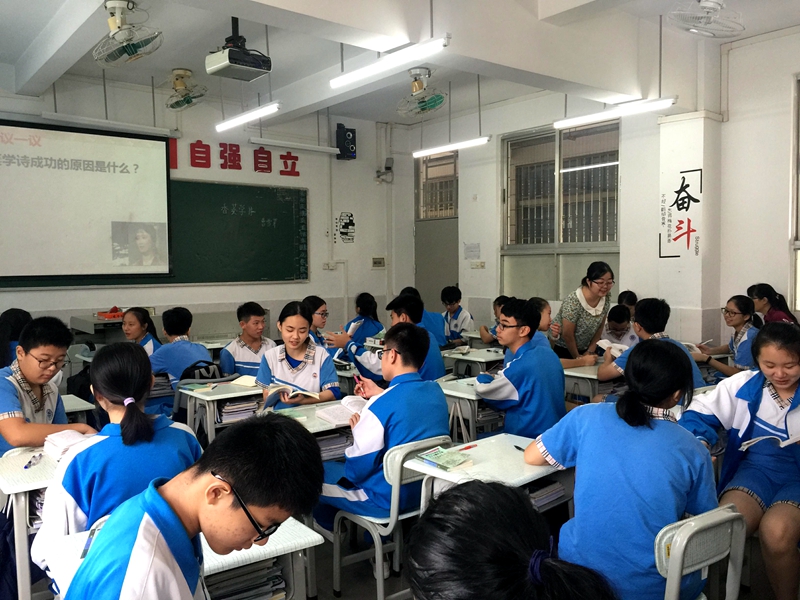 本网讯 “一个是阆苑仙葩, 一个是美玉无瑕……”。2017年9月15日星期五早上第一节课,悠扬的歌曲《枉凝眉》从初三(3)班的教室传来,原来这是语文老师黄晓凌的公开课《香菱学诗》。