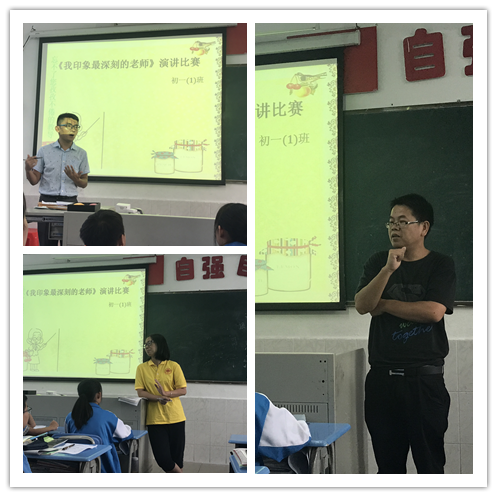 本网讯 老师,在我们从幼稚走向成熟,从愚昧走向文明的路上,您用生命的火炬,为我们开道。为弘扬传统美德,培养我校学生尊师的意识,中学学生处9月在初一年级启动了“我印象最深刻的一位老师”演讲会。并且在10月9日-12日在初一各班完成了初赛。在初赛阶段,各班精心挑选出6名选手同场竞技,他们用自信的声音和丰富的肢体语言诠释出他们自己心中印象最深刻的一位老师,通过典型的事例满满表达了心中对老师的尊敬和爱戴。也让现场参加演讲会的老师们感受到来自学生的浓浓情感。