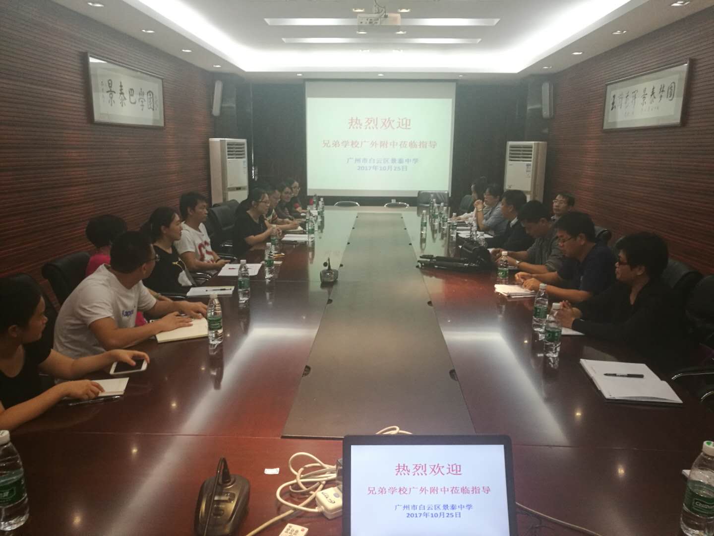 本网讯 羊城十月,丹桂飘香。为提高教师素质、促进教师专业发展,将教研落到实处,增进与兄弟学校的切磋交流与学习, 10月25日14时许,袁宇迪副校长带领我校教学处、学生处及各学科组长一行十人驱车来到景泰中学进行校际交流。景泰中学黄校长及相关领导热情地接待了我们。