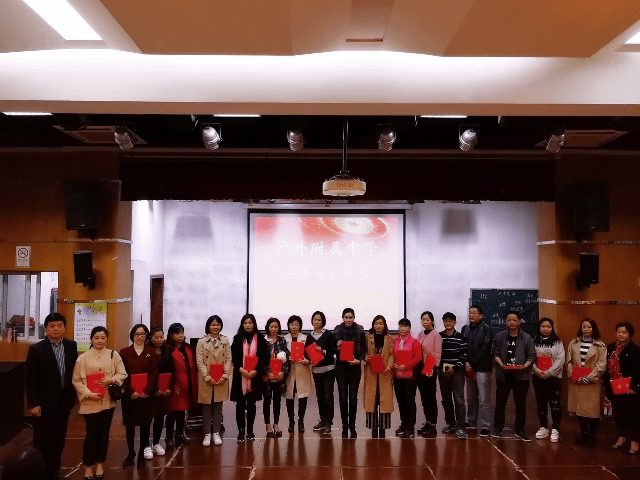 接着,张晓鹏级长邀请初一级家委会成员上台接受一份大礼,这也是一个承诺、一种责任。那就是附中吴玉爱校长为他们颁发的家委会聘书。