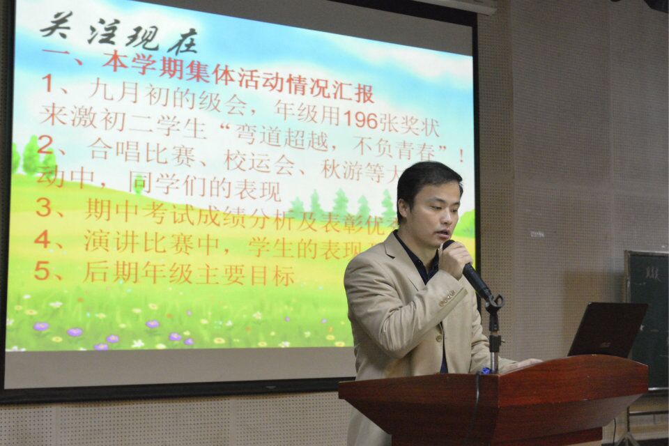 随后,陈级长就本学期前半期初二年级教育教学及活动开展情况做了全面汇报。如:开学伊始召开年级会,激励学生“弯道超越,不负青春”!依次举行了合唱比赛、演讲比赛、校运会、秋游等大型活动,召开期中考试表彰大会等。在日常教学活动中学校突出对学生良好人格的塑造。如:月考设置无人监考考场,培养学生的诚信意识;表彰大会上教育学生树立胜不骄败不馁、求真务实、勇夺先进、赶超先进的学习作风;校运会上鼓励学生开拓创新、勇往直前,同学们将击剑、球类、武术、舞蹈、轮滑和平衡车、民族舞龙、民族花伞、创客课程和特色棒球等表演呈现大家眼前,形式多彩、身姿矫健。
