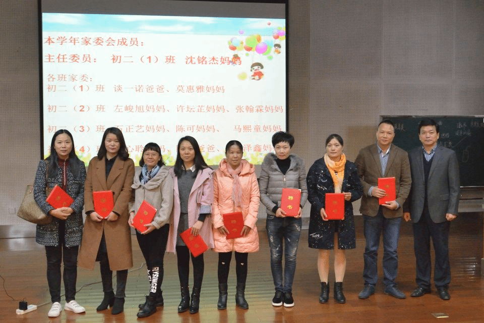 首先,陈级长介绍本学年家委会成员,感谢他们对年级组工作的支持和配合,吴校长给家长颁发了聘书。
