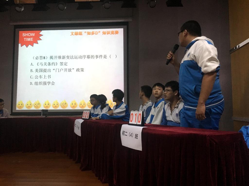 本网讯 11月27日下午,广外附中举行了第一届“知多D”初二年级文综知识竞赛。此次活动由文综组承办,初二年级各班均派出了精英学生组成队伍参加比赛。