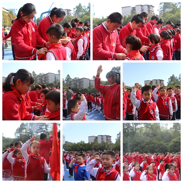 老队员为新队员佩戴红领巾