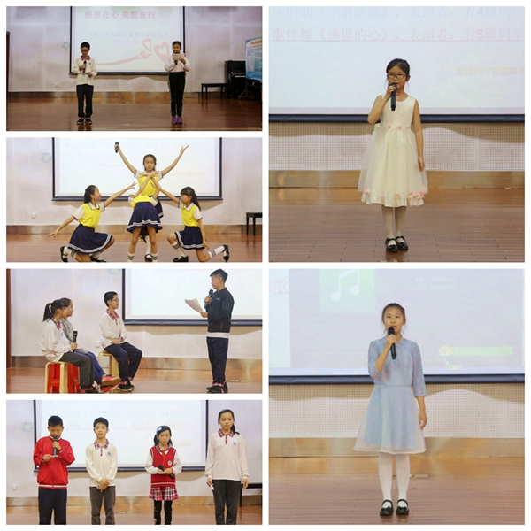 “花朵无私地让蝴蝶采集它的花粉,蝴蝶也同时把花粉撒到天涯海角,这是蝶对花的感恩。海水慷慨地让鱼儿遨游在他的怀里,鱼儿也同时给寂静的海水添了一份生机,这就是鱼儿对水的感恩……”仪式在主持人深情的朗诵中开始了。五3班的李雯妮同学给大家带来一首《感恩有你》的歌曲,是啊,怀抱一颗感恩的心,犹如在生命的旅途中点燃了一盏明灯。五2班王诗彤、黄依瑾等同学通过小品,让我们认识到母爱如海,父爱如山,父母是天底下最伟大无私的。五1班陈宇璇同学给大家带来了感恩的小故事、五4班同学诗歌朗诵《学会感恩》、五5班同学歌伴舞《感恩的心》将启动仪式推向高潮。接着,主持人宣读了本学期主题教育系列活动。