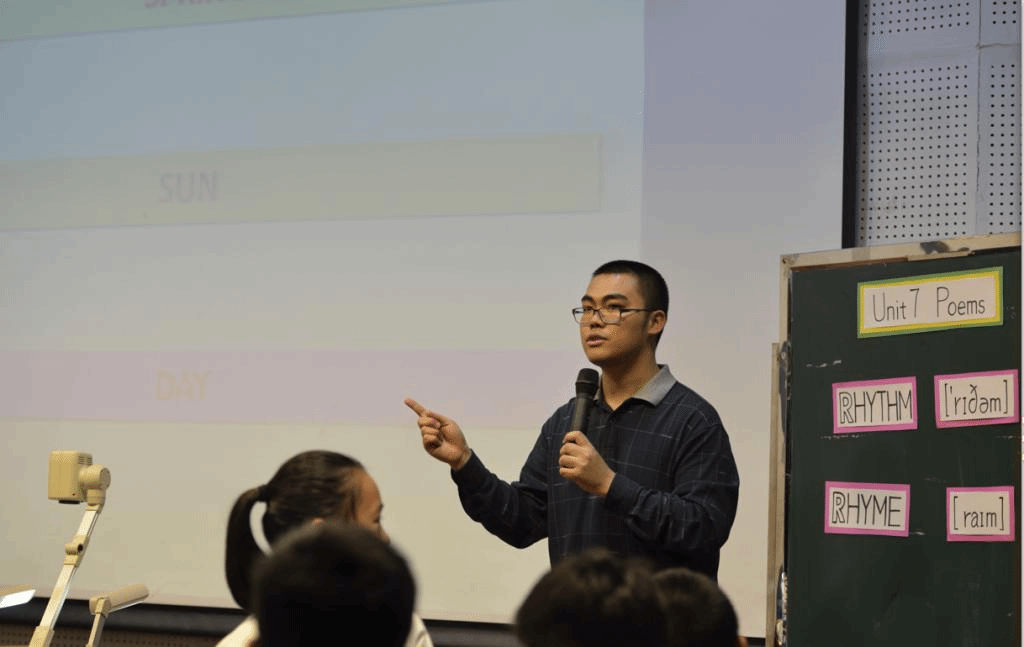 随后,张老师通过两个R来承上启下。一是英语重弱读交替的Rhythm(节奏),二是Rhyme(韵律)。通过简单的从诗歌中找韵脚的测试后,张老师安排了一个神秘而有趣的押韵游戏。