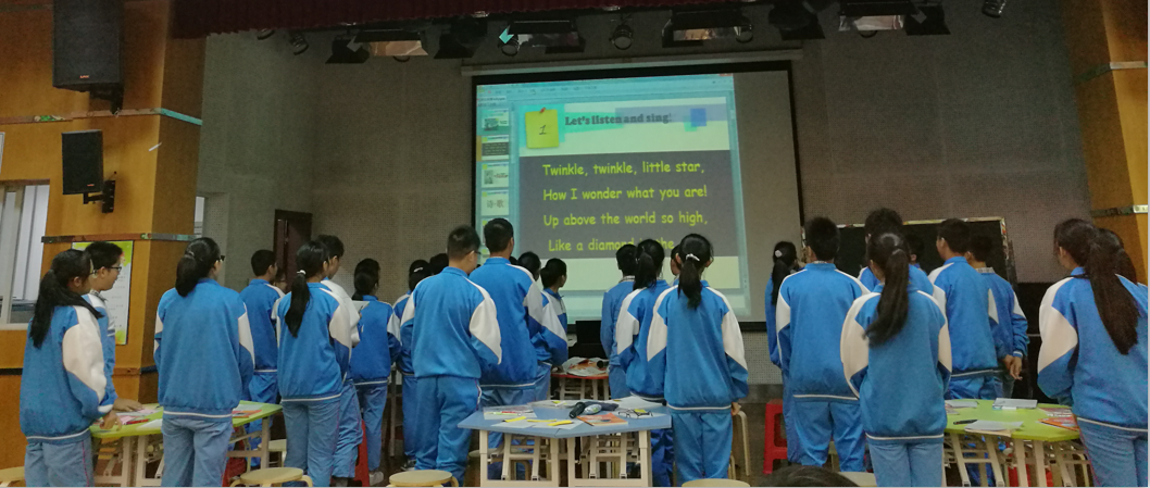 课前三分钟,作为广外附中英语教学特色,张老师以梵高名作《星夜》引入,邀请全班同学起立,一起哼唱耳熟能详的英语歌曲《Twinkle, Twinkle, Little Star》。伴着同学们悦耳的歌声,公开课正式开始。