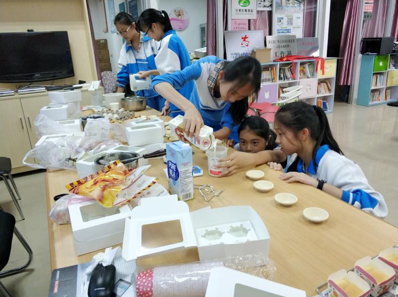 在活动现场,社区工作人员教大家如何烘焙蛋糕、蛋挞等糕点,首先向大家演示烘焙的步骤,成份配比、烘焙时间等要点。首先,同学们按照网上的教程制作蛋挞,牛奶、细砂糖、淡奶油等都要精确到克数,同学们都感觉很有趣、是一种很神奇的体验。所有的材料准备好后就放到提前预热的烤炉里进行烘焙。二十分钟后,蛋挞熟了,打开烤箱后顿时芳香四溢,同学们大呼"哇,超想吃的!"第二个要制作的是蛋糕,当蛋糕从烤箱里拿出来的时候,同学们一声声惊呼"太棒了,原来我们自己也可以做出这么如此香喷喷的蛋糕,回家也要给我妈妈做"。