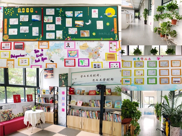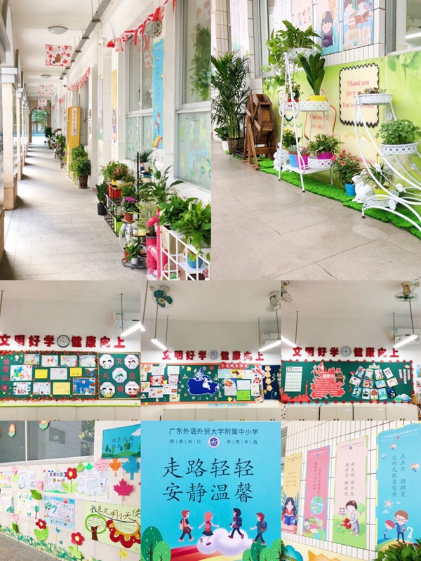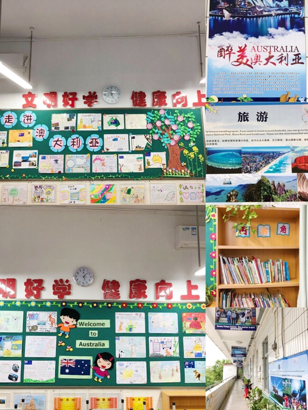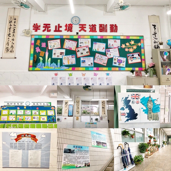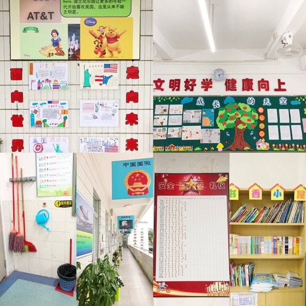 本着不断优化、创新的模式,这学期在“净化教室”、“美化教室”、“绿化教室”的基础上,结合我校的外语特色,增加了“国家主题特色呈现”。各年级师生,群策群力,精心构思,认真布置,打造出了特色的班级文化及年级主题文化。“学习园地”里记录着学生的成长足迹,有学生的优秀作业展示;“理想树”记录着班级学生的理想和奋斗目标,激励着班级学生不断努力去追寻梦想;“阅读角”,各类书籍培养孩子们阅读的兴趣、增长见识;“荣誉栏”,记载着学生在学习、生活等方面的争先创优活动; 加拿大、澳大利亚、新西兰、英国、美国、南非等国家的年级特色外语文化带领同学们走进一个个遥远的国度,向同学们展示了不同的地理人情与风俗习惯,精彩纷呈……