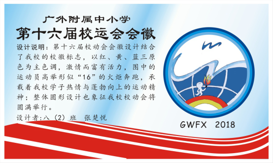 本届运动会会徽由来自八年级(2)的张楚悦同学设计,整体设计以红、黄、蓝三原色为主调,激情而富有活力,象征我校运动会将圆满举行。