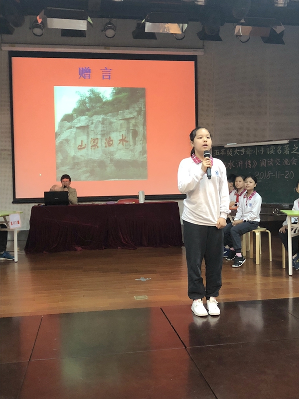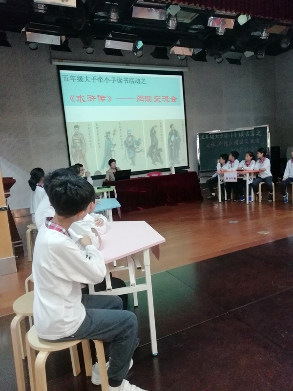 本网讯 《水浒传》是中国四大名著之一,是我国文学史上的经典作品。精彩的故事情节、鲜明的人物个性,犹如一坛醇酒,滋养了一代又一代中国人。为了弘扬中华经典,传承民族文化,让学生们读其文、感其情,我校五年级语文组在范秀红老师的策划带领下,于11月20日下午在云山礼堂隆重举行了“大手牵小手读名著系列之——《水浒传》阅读交流会” 。