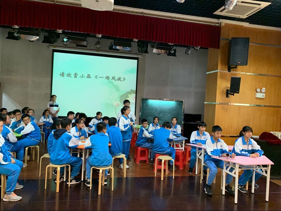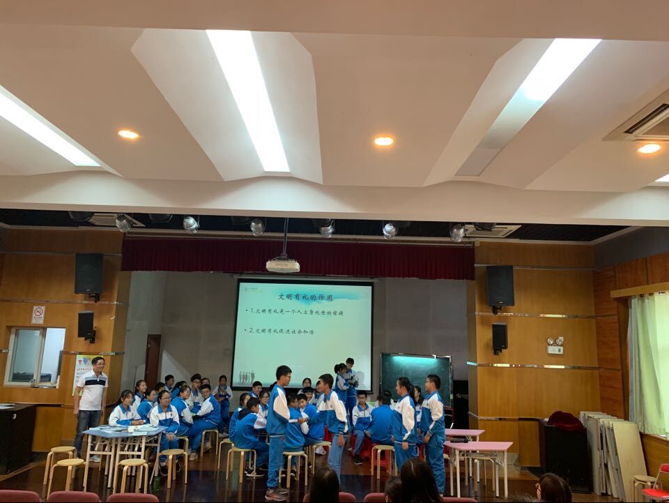 首先展示的是初二年级题为“文明礼仪伴我行”的班会课。这节课堂上,大部分时间学生是主场,老师辅助并做总结性的发言,充分发挥了学生的积极性和自主能动性。初二的同学通过生动形象的小短剧,向我们传达生活中应该讲文明,懂礼仪,这样才能构建良好的人际关系。