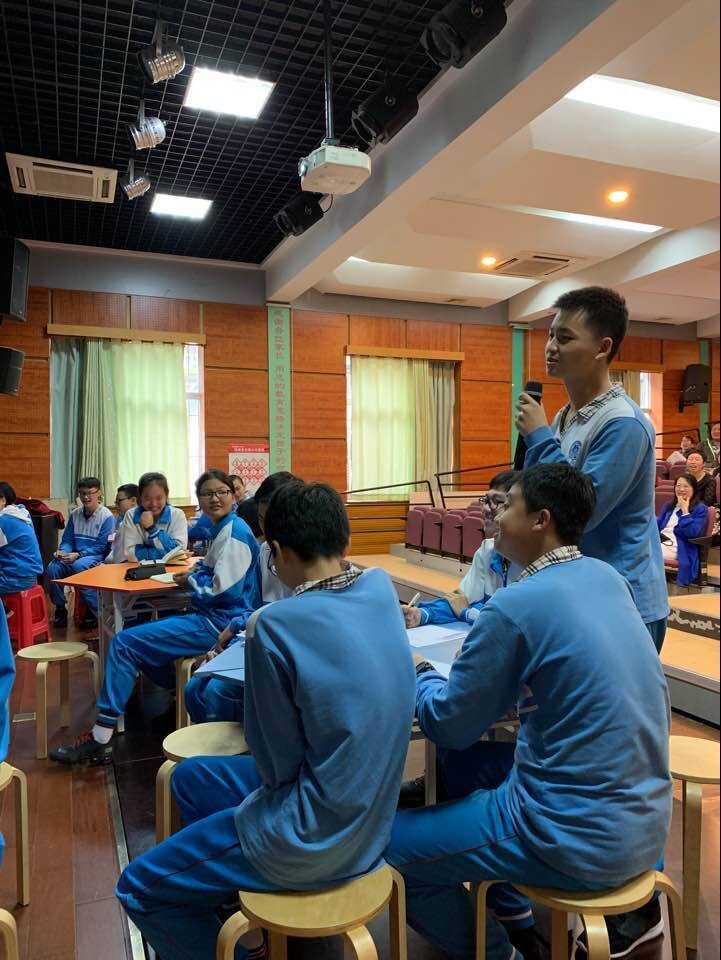 最后展示的是初三(3)班,他们的主题是“学会尊重他人”。老师通过两个视频,两位主人公不同的表现,引出“尊重”这个话题。同学们倾情投入,激烈地讨论。初三年级的亮点在于班主任老师和学生共同担任主持人,既发挥了学生的主观能动性,又让老师掌握主动权。