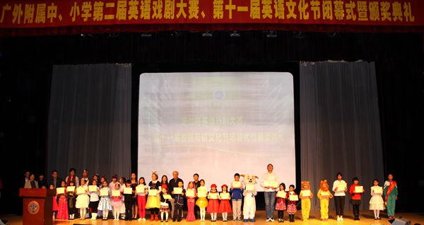 本网讯 12月11日下午,我校第二届英语戏剧比赛、第十一届校园英语文化节闭幕式暨颁奖典礼在云山会堂举行。华南理工大学外教Micah Robert,广外新闻学院外教Louis Berney、英语教育学院肖衡碧应邀出席了本次活动并担任评委,现场还邀请了马克汉姆国际教育集团文亮、Lukas作指导,学校领导出席观看了比赛。