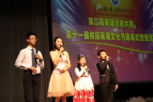 本届英语文化节的主题是Use English,Enjoy English , 通过一系列丰富多彩的英语活动,营造学英语、说英语、用英语的学习氛围,让学生在英语交流中感受英语的魅力,激发学生学习热情。同时,为学生提供展示才能、提高自信的舞台。经各年级历时一个月的海选和初赛,共有16个代表队进入决赛。参赛节目形式新颖,内容丰富,《小红帽》《灰姑娘》《卖火柴的小女孩》《人鱼公主》和《美女与野兽》等对传统话剧进行了创新、改编,充满戏剧性的故事情节和意想不到的故事结局,吸引全场观众眼球,令人捧腹大笑;原创作品《环游世界》让人眼前一亮,跟随者演员们的脚步,观众们对世界各地也有了更深刻的认识;英语小剧《卷毛头》《小狮子找食物》《彼特潘》《沃克农场的早晨》《快乐上学日》《万圣节快乐》,演员们华丽的服饰,精致的妆容,如幻如真的背景更使作品增色不少;《喜羊羊和灰太狼》《小屁孩日记》对大家熟悉的流行影片进行改编,赋予新意,令人耳目一新;舞蹈秀《我心飞翔》,歌唱表演《青春永驻》,也赢得了观众们的阵阵欢呼声。整场比赛高潮迭起,惊喜连连,演员们投入的演出和精彩的舞台表现力,时而严肃时而诙谐的舞台气氛,将观众带进一个个精彩的话剧世界里,享受了一场难忘的英语视听盛宴。