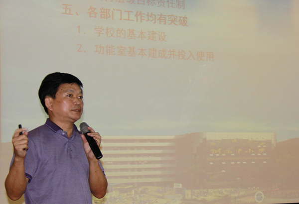会上,吴玉爱以“我们的形势和任务”为题做新学期工作布置。他从办学理念、办学质量、 办学特色、学校管理、各部门工作和财务状况等六方面回顾了过去一年多的工作情况。目前我校在教学质量,特色、校园文化,教职工专业化水平,学生综合素质和学校管理等还有待提升,他认为,学校目前仍处于创业时期。