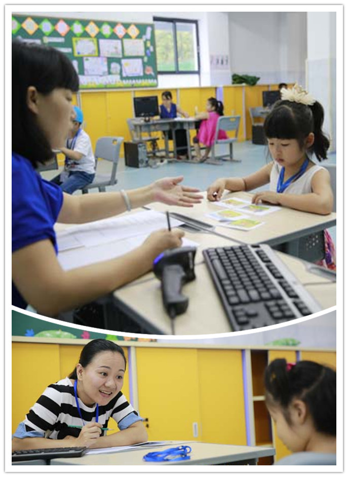 来自广外外校60多名老师担任本次见面活动的评委,我校的老师只负责协调,不参与打分。小朋友们佩带的见面牌上只有条形码和本人照片,工作人员通过扫描码随机进行分组,16人为一组, 6组共96人同时进行,面谈老师完全互不知情。此外,面谈老师打分扫描时看不到学生姓名、照片,网上打分后由大学教育技术中心开发的系统进行自动计算,避免以往人工计分出错。
