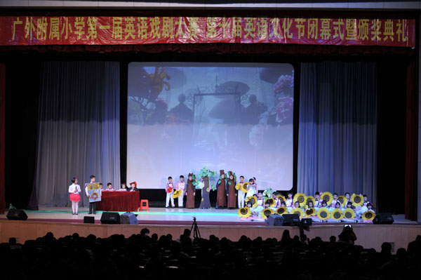 本届英语戏剧大赛的主题是Drama English,Dream-true English,是利用戏剧表演的形式,激发学生学习英语的兴趣,提高英语学习水平和语言表达能力,营造良好的英语学习气氛。经各年级历时一个月的海选和初赛,共有11个代表队进入决赛。在戏剧比赛中,同学们以标准的英语语言,活泼的形象演绎了寓理于乐的《小马过河》、《骄傲的孔雀》、《为什么乌龟的背不是平的》、《丑小鸭》和《小猫钓鱼》;温馨感人的《永远的朋友》、《小狮子找妈妈》和《海底总动员》,还有描摹人性的《白雪公主》等。节目内容健康向上,同学们不但可以从中了解异国文化,体验生活中的真善美,而且可以享受英语学习的快乐,并为观众们奉上了一场戏剧盛宴。最终决出特等奖3名、一等奖4名、二等奖4名和最佳表演奖、最佳服装奖、最具人气奖等奖项,大大肯定和鼓励了同学们参与的热情。