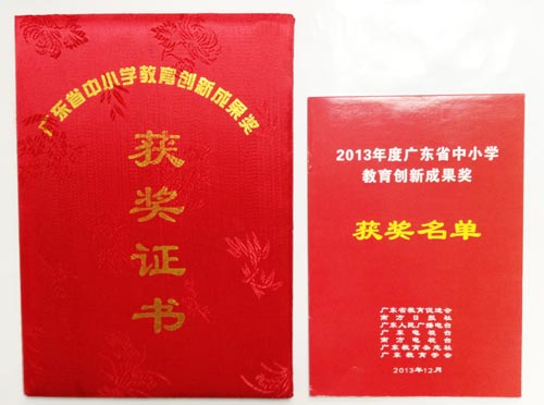 广东省中小学教育创新成果奖从1990年至今已有24年历史,是广东省教育界的一个重大奖项,由广东省教育促进会组织牵头,联合广东电视台、南方电视台、南方日报社、广东人民广播电台、广东教育学会、广东教育杂志社共同举办。2013年广东省中小学教育创新成果奖上报项目共421项,在学科评审的基础上,又经过综合评审,评出一等奖2项,二等奖36项,三等奖109项。