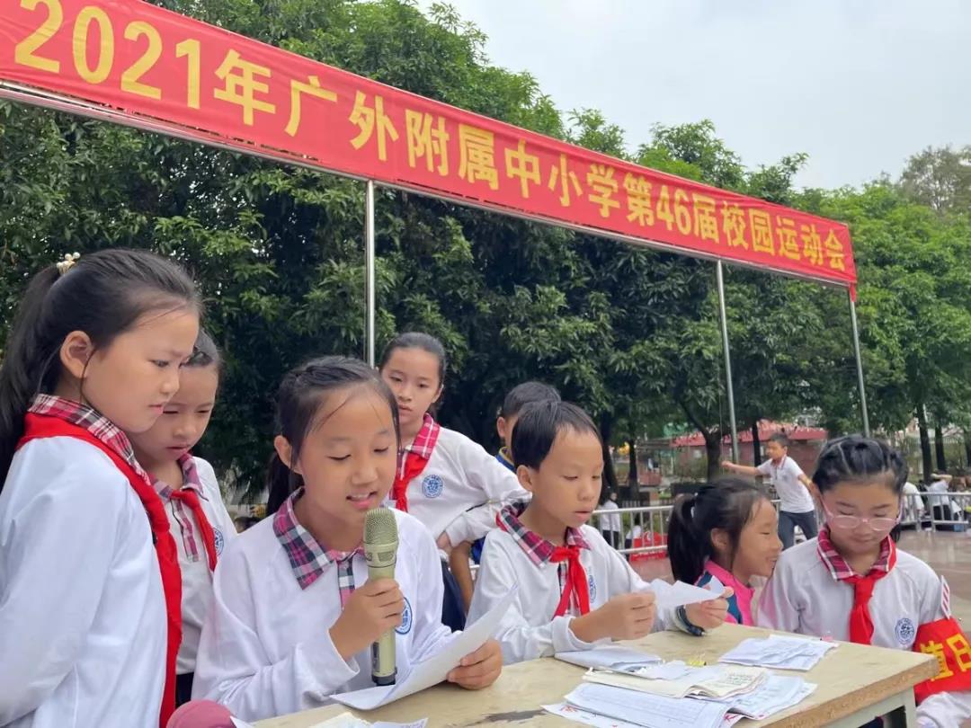 金风送爽,丹枫迎秋。11月4日清晨,伴随着庄严肃穆的升旗仪式,广外附属中小学第46届秋季运动会在学校大操场拉开帷幕,全校师生参加开幕式,由艺体部副主任王琪、四1班班主任陈雅男老师主持。