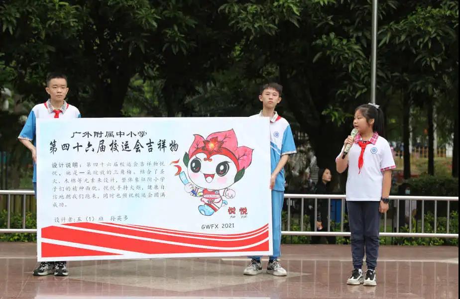 随后揭晓了本届校运会的会徽和吉祥物。会徽和吉祥物分别由七4班邱紫琪同学和五1班孙英多同学设计,她们先后上台介绍了自己的设计理念。
